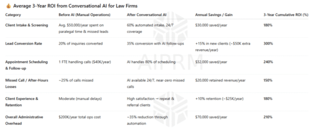 3-year ROI projection table showing the average savings and returns small to mid-size law firms can expect after adopting a Conversational AI Agent (text or voice-based).